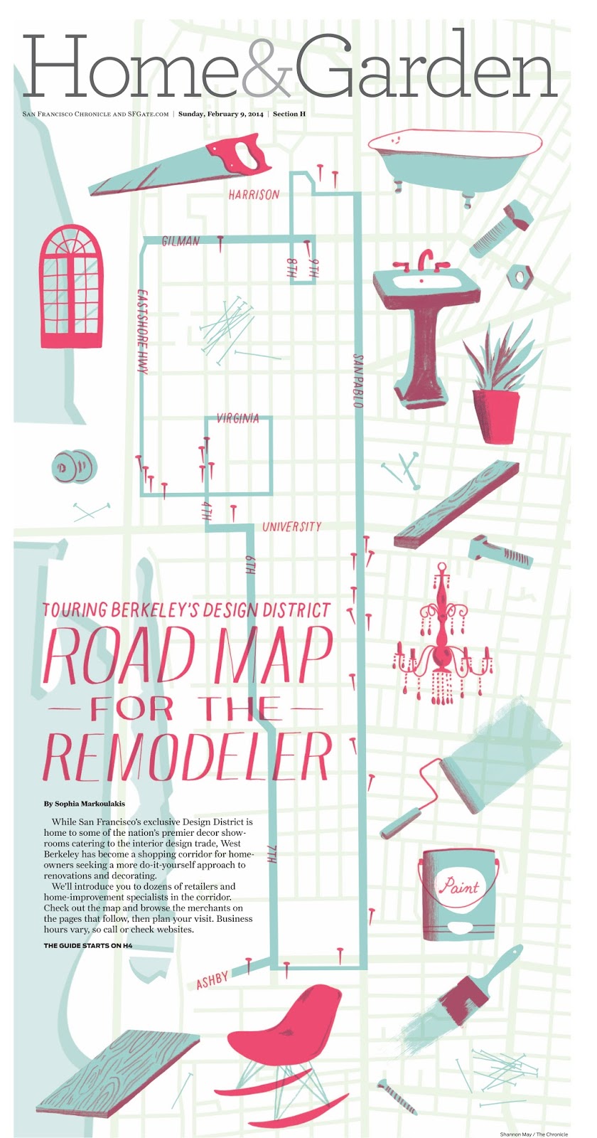 Handy dandy map of the design loop in Berkeley, where you can get just about anything you need to remodel your home! I think the paint brush is my favorite part. Thanks to AD Erick Wong and designer Jillian Welsh for working with me on this! Maps are hard.
