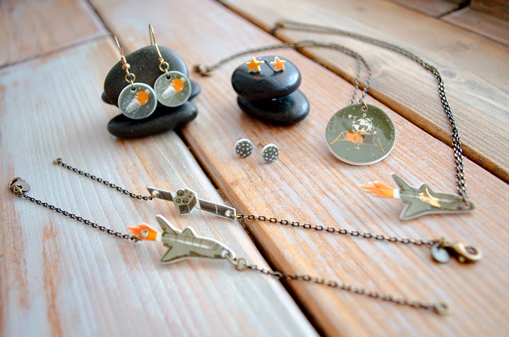 Tonight is the opening for Light Grey Art Lab's “Omnibus Treasury” show! Here is my collection, inspired by old NASA memorabilia and science textbooks. You can purchase the jewelry in person until July 3rd, or you can get it at LGAL's online shop RIGHT NOW.