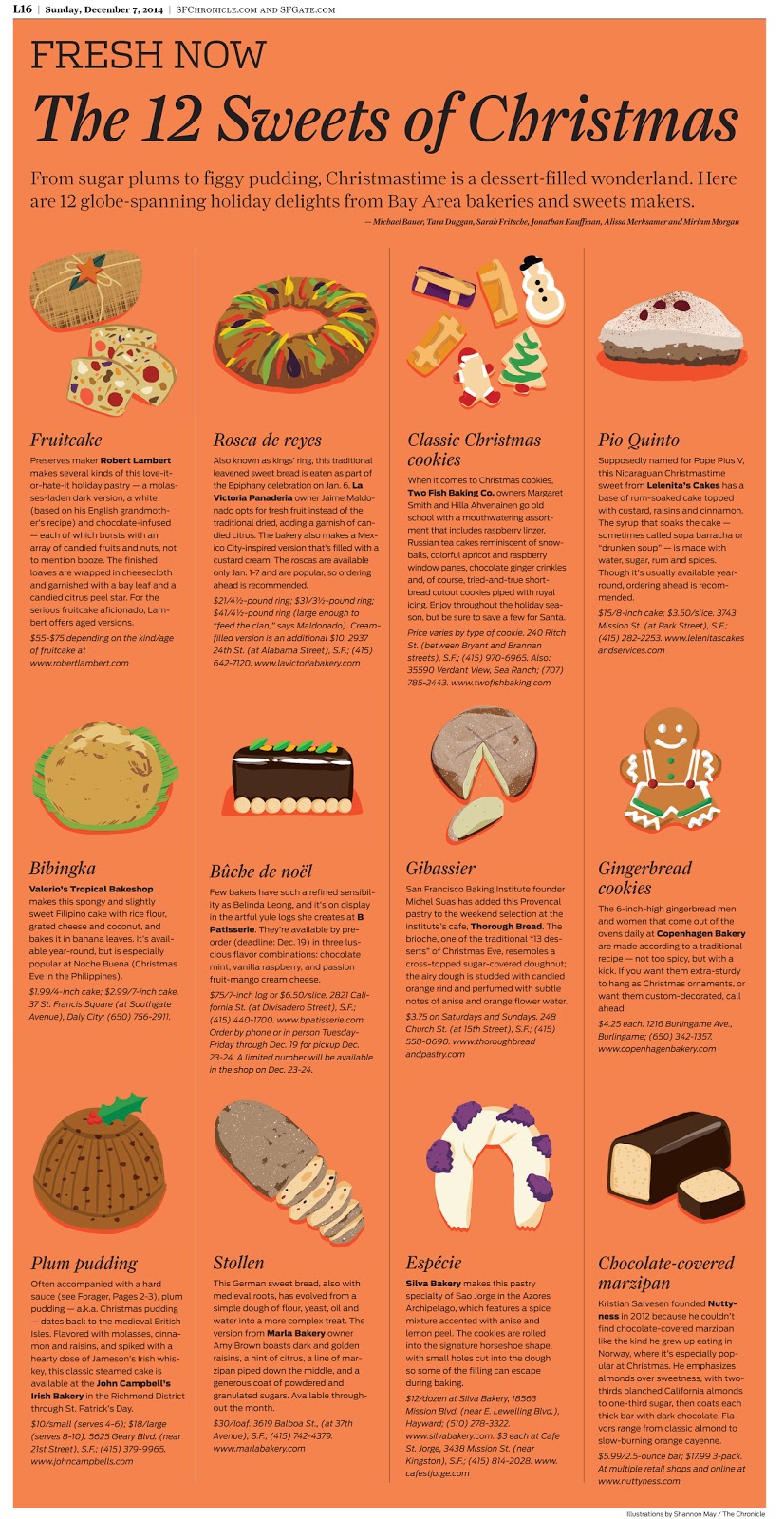 Spot illustrations of holiday sweets from around the world and where you can find them in the Bay Area for the San Francisco Chronicle's Food + Home section.
