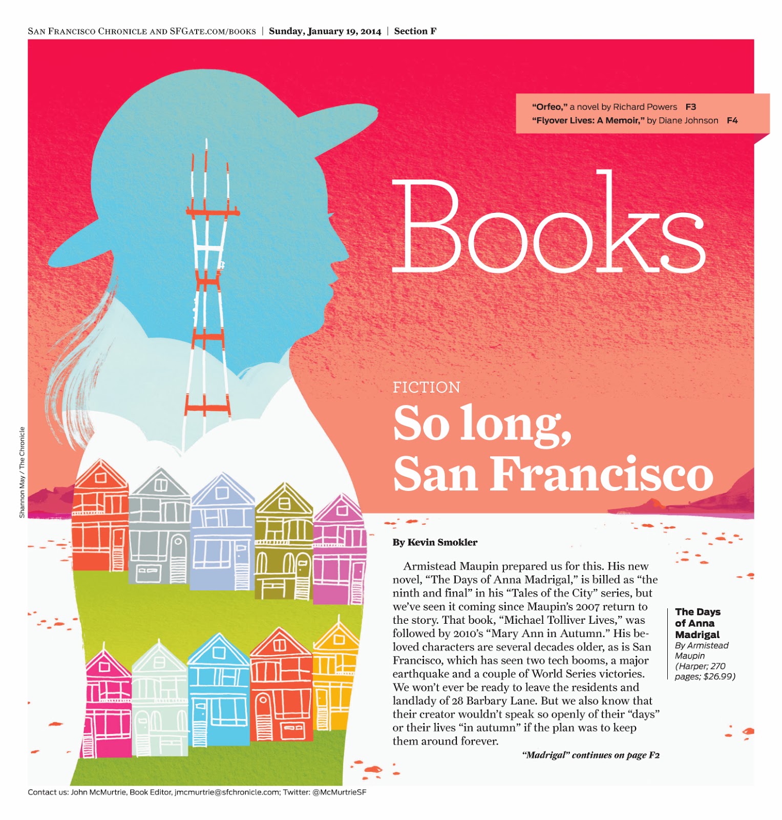Like all good things, Armistead Maupin's "Tales of the City" series, which originally ran serialized in the Chronicle, must come to an end. Here's my illustration for "The Days of Anna Madrigal," Maupin's last chapter for the residents of Barbary Lane, reviewed by Kevin Smokler. You can read the review